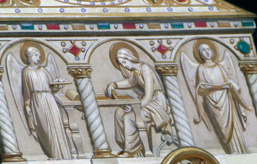 Il s’agit du reliquaire ouvragé montrant, au centre, la Vierge Marie, assise à son métier, entre deux anges qui la servent, tissant la tunique de son Fils : « Une belle pièce d’étoffe, comme la tunique du grand prêtre dans la liturgie mosaïque. L’Église est figurée par le vêtement que la Vierge a tissé pour le Christ, la tunique sans couture, fruit de son sacrifice. Cette robe reste indemne pour nous montrer que jusqu’à la fin du monde, l’Église, une, sainte, catholique et apostolique, restera l’œuvre éternelle de la Vierge Marie. » (sermon de l’abbé de Nantes, 18 avril 1992 )