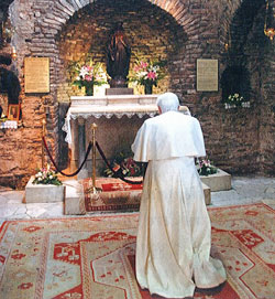 « La deuxième journée m’a conduit à Éphèse, poursuit Benoît XVI, et je me suis donc retrouvé rapidement dans le“ premier cercle ” du voyage, au contact direct de la communauté catholique. Près d’Éphèse, en effet, dans une charmante localité appelée“ Colline du rossignol ”, qui surplombe la mer Égée, se trouve le sanctuaire de laMaison de Marie. Il s’agit d’une antique petite chapelle, bâtie autour d’une maisonnette que, selon une très ancienne tradition, l’apôtre Jean fit construire pour la Vierge Marie, après l’avoir amenée avec lui à Éphèse. Jésus lui-même les avait confiés l’un à l’autre quand, avant de mourir sur la croix, il avait dit à Marie :“ Femme, voici ton fils ! ” et à Jean :“ Voici ta mère ! ”(Jn 19, 26-27) Les recherches archéologiques ont démontré que ce lieu est depuis des temps immémoriaux un lieu de culte marial, également cher aux musulmans, qui s’y rendent habituellement pour vénérer Celle qu’ils appellent“ Meryem Ana ”, la Mère Marie. Dans le jardin contigu au sanctuaire, j’ai célébré la sainte Messe pour un groupe de fidèles venus de la proche ville d’Izmir, ainsi que d’autres parties de la Turquie et également de l’étranger. Auprès de la“ Maison de Marie ”, nous nous sommes véritablement sentis“ à la maison ” et, dans ce climat de paix, nous avons prié pour la paix en Terre sainte et dans le monde entier. J’ai voulu rappeler en ce lieu la mémoire de don Andrea Santoro, prêtre romain, martyr de l’Évangile en terre turque. »